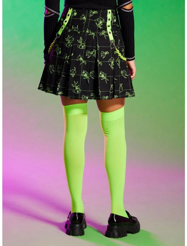 Straight from Planet Irk, your fave Invader Zim duo is here to wreak havoc on Earth! Get ready to become the greatest Invader of all time with this pleated skirt, featuring a neon green grid print and toss of Zim and GIR. Comes with removable side chains, plus neon green grommet tape at the hip that allows you to customize the placement of the center chain. Complete with back zipper closure.