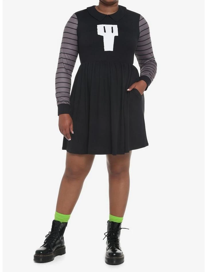 Take your look to another level! Inspired by your favorite gamer, thisย Invader Zimย dress is modeled after Gaz Membrane’s outfit, featuring her grey and black striped long-sleeves and signature skull. Comes with a collar with a back key hole closure and side seam pockets. Wear it out the next time you grab a slice of pizza!