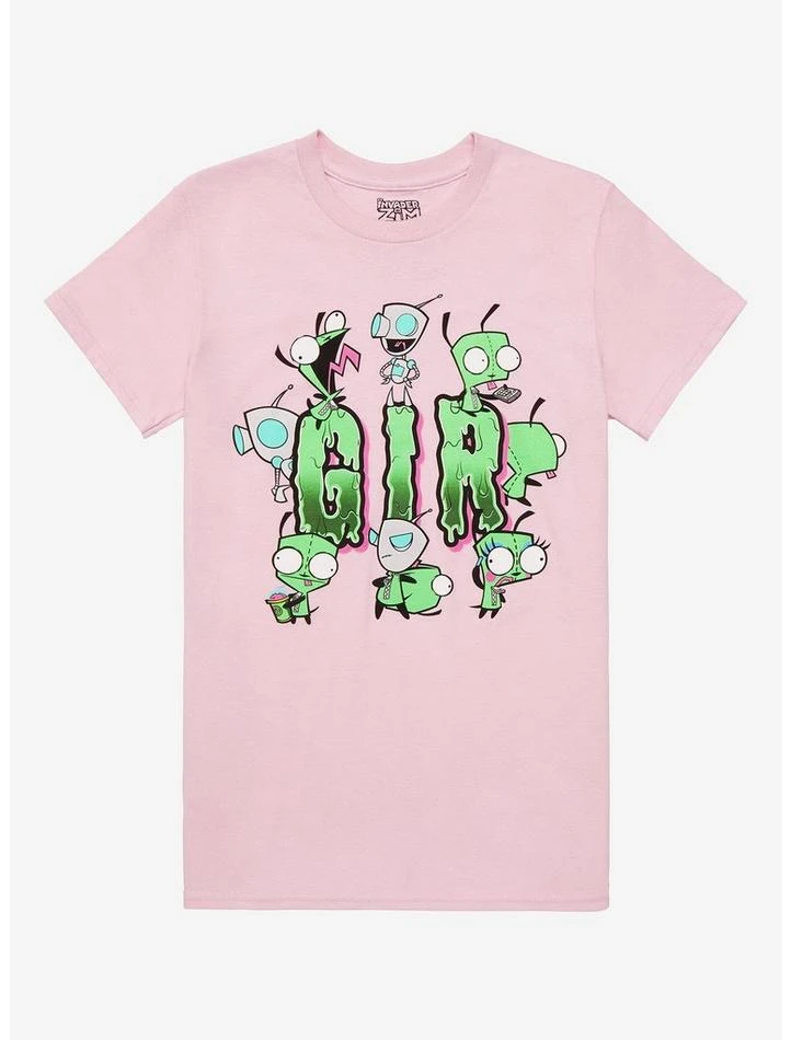 Going out on a snack run? GIR most definitely wants to tag along! Rep your fave robot dog whether you’re grabbing some grub or taking over planet Earth with this Invader Zimย tee, featuring “GIR” in dripping font and GIR in different poses and outfits all around.