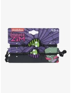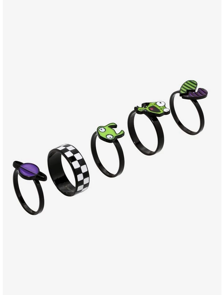 Ready to have the coolest set of rings in all of the Irken Empire? Get ready to rule Earth with these Invader Zim rings, featuring black-tone pieces with charms of GIR, broken hearts and more, plus a ring band with a black & white checkerboard pattern.