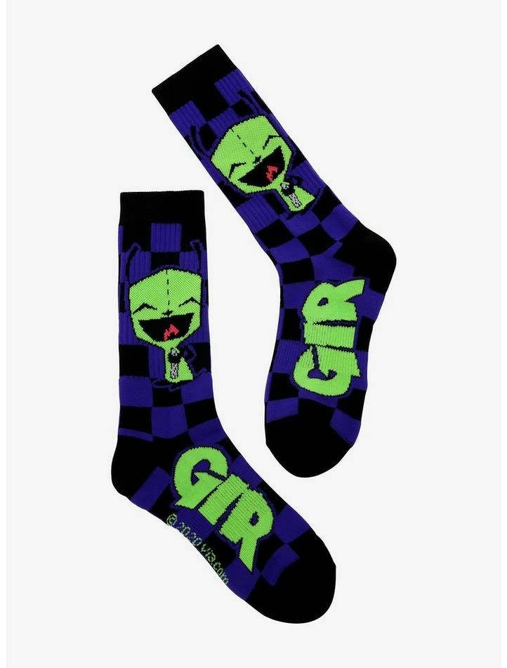 GIR is adorable in his Earth disguise. From Invader Zim, these purple & black checkered crew socks feature GIR on the outer facing sides and “GIR” on the foot.