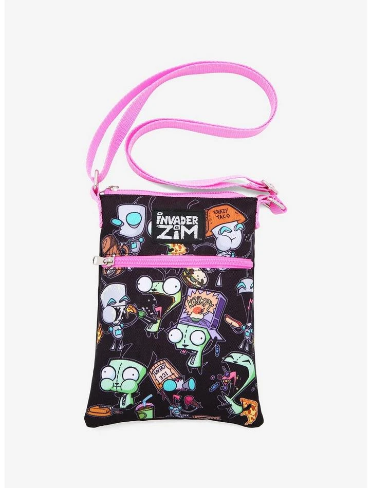 Attempting to conquer Earth sure can make you hungry. This passport bag from Invader ZimΒ features an allover print of the always hungry robot, GIR, eating various snacks. On the back, there is an image of a pig with a cheeseburger and taco. Adjustable crossbody strap, front zipper pocket, top zipper closure and silver tone hardware.