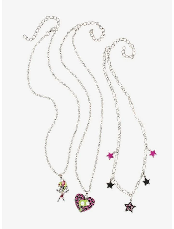 Before you head out to take over planet Earth, make sure you’re rockin’ some out-of-this-world necklaces! This Invader ZimΒ necklace set features colorful charms of Zim and GIR on silver-tone chains, plus a layering piece full of black & pink stars.