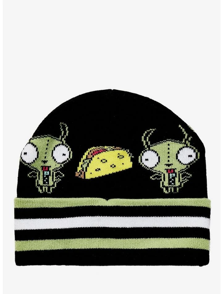 Taking over Planet Earth? It may get a little chilly, so keep warm with this cozy Invader ZimΒ beanie! Featuring a GIR and tacos all across the top, with bold green & white stripes on the fold.