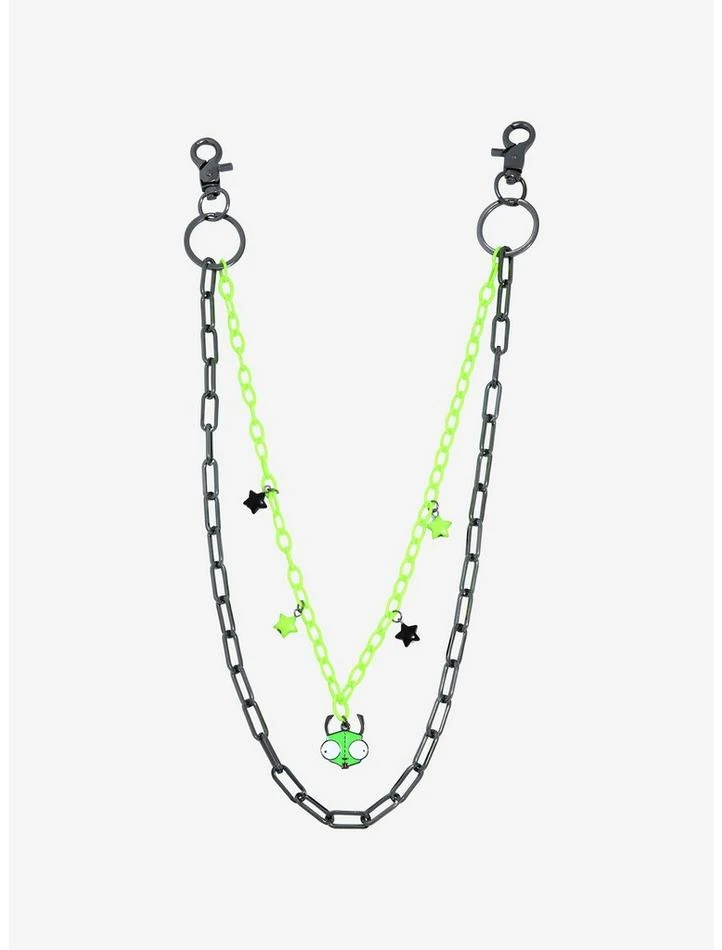 Make sure your snack cash stays secure with this Invader Zim wallet chain! This chain comes with a gunmetal-tone chain and a neon green chain with star and GIR charms. Complete with trigger hooks.
